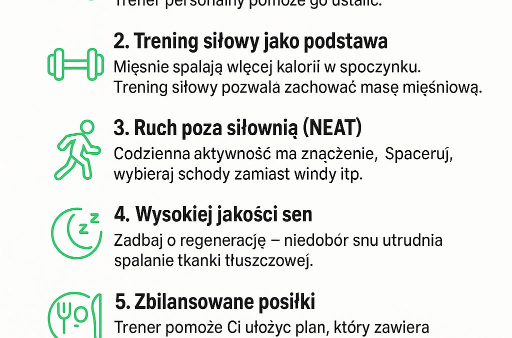 Zbyt krótki lub przerywany sen podnosi poziom kortyzolu, co utrudnia spalanie tłuszczu. Trener przypilnuje, by regeneracja była częścią planu, a nie dodatkiem.